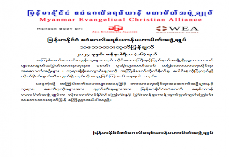 အကြမ်းဖက်သောင်းကျန်းသူများအနေဖြင့် ဘုရား၊ စေတီပုထိုးနှင့် ဘာသာရေးအဆောက် အဦများအား ဖြိုချဖျက်ဆီးခြင်းများ လုပ်ဆောင်လျက်ရှိခြင်းကို လွတ်မြောက်ခြင်း အသင်းတော် (ရန်ကုန်)က လုံးဝလက်မခံနိုင်ပါကြောင်းနှင့် ပြင်းထန်စွာကန့်ကွက်ရှုတ်ချပါကြောင်း သဘော ထားထုတ်ပြန် ကြေညာအပ်ပါသည်။