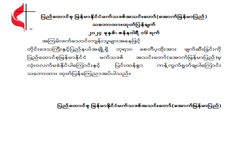 အကြမ်းဖက်သောင်းကျန်းသူများအနေဖြင့် တိုင်းဒေသကြီးနှင့်ပြည်နယ်အချို့ရှိ ဘုရားစေတီပုထိုးအား ဖျက်ဆီးခြင်းကို ပြည်ထောင်စုမြန်မာနိုင်ငံ မက်သဒစ်အသင်းတော် (အောက်မြန်မာပြည်)မှ လုံးဝလက်မခံနိုင်ပါကြောင်းနှင့် ပြင်းထန်စွာ ကန့်ကွက်ရှုတ်ချပါကြောင်း သဘောထား ထုတ်ပြန်ကြေညာအပ်ပါသည်။