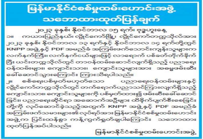 KNPP အဖွဲ့နှင့် PDF အမည်ခံအကြမ်းဖက်သောင်းကျန်းသူများသည် နိုဝင်ဘာ ၁၃ ရက်တွင် စစ်ရေးနှင့် သက်ဆိုင်သောပစ်မှတ်မဟုတ်သည့် ကယားပြည်နယ်၊ လွိုင်ကော်မြို့ရှိ လွိုင်ကော်တက္ကသိုလ်အား လက်နက်ကြီး၊ လက်နက်ငယ်များဖြင့် ရည်ရွယ်ချက်ရှိရှိ လာရောက်ပစ်ခတ်တိုက်ခိုက်ခဲ့ကြောင်းသိရှိရပြီး တက္ကသိုလ်တွင် တာဝန်ထမ်းဆောင်လျက်ရှိသည့် ပညာရေးဆိုင်ရာဝန်ထမ်းများနှင့် ပညာသင်ကြားလျက်ရှိသည့် ကျောင်းသား၊ ကျောင်းသူများအား အတင်းအဓမ္မ ဖမ်းဆီးခေါ်ဆောင်သွားခဲ့ကြောင်း သိရှိရသည်။