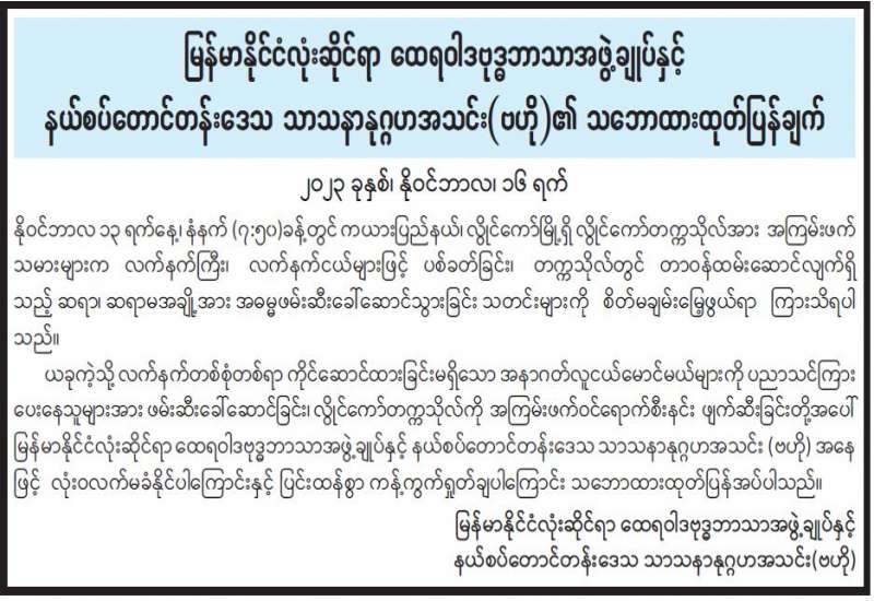 ယခုလတ်တလောကာလတွင် အများပြည်သူအကျိုးစီးပွားပျက်စီးစေရန် မသမာသူလူတစ်စုက လူမှုကွန်ယက်စာမျက်နှာများတွင် သတင်းမှားများ ဖြန့်ဝေလျက်ရှိကြောင်း သိရှိရပါသည်။ အဆိုပါ လူမှုကွန်ရက်စာမျက်နှာများနှင့် အင်တာနက် Website များတွင် ဖြန့်ဝေနေသော ဘဏ်များရှိ အပ်ငွေစာရင်းများမှ ငွေသားထုတ်ယူခြင်းများကို ကန့်သတ်နေကြောင်း ထုတ်ပြန်ချက်များသည် မဟုတ်မမှန်သောသတင်းမှားများသာ ဖြစ်ကြပါသည်။ အလားတူ အချို့ပုဂ္ဂလိကဘဏ်များတွင် ဝန်ထမ်းများကို လစာများကြိုတင် ထုတ်ပေးကြောင်း သတင်းများသည်လည်း သတင်းမှား များဖြစ်ကြပါသည်။