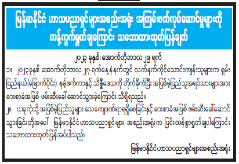 မြန်မာနိုင်ငံသဘင်အစည်းအရုံး(ဗဟို)၏ သဘောထားထုတ်ပြန်ချက်