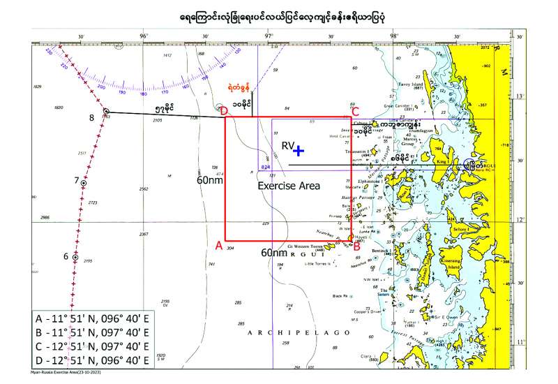 ၁။ ရေကြောင်းလုံခြုံရေး ပင်လယ်ပြင်လေ့ကျင့်ခန်းကို ၂၀၂၃ ခုနှစ် နိုဝင်ဘာ ၇ ရက်မှ ၉ ရက်ထိကာလအတွင်း ကပ္ပလီပင်လယ်ပြင် မြောက်ပိုင်းရေပြင်၌ ရေပြင်၊ ဝေဟင်၊ ရေအောက် လေ့ကျင့်ခန်းများနှင့် လက်တွေ့ပစ်ခတ်ခြင်းများ (Live Firing) ဆောင်ရွက်သွားမည်ဖြစ်ပါသည်။ လေ့ကျင့်ခန်း ဧရိယာအဖြစ် Point A မြောက်လတ္တီတွဒ် ၁၁ ဒီဂရီ ၅၁ မိနစ်၊ အရှေ့လောင်ဂျီတွဒ် ၉၆ ဒီဂရီ ၄၀ မိနစ်၊ Point B မြောက်လတ္တီတွဒ် ၁၁ ဒီဂရီ ၅၁ မိနစ်၊ အရှေ့လောင်ဂျီတွဒ် ၉၇ ဒီဂရီ ၄၀ မိနစ်၊ Point C မြောက်လတ္တီတွဒ် ၁၂ ဒီဂရီ ၅၁ မိနစ်၊ အရှေ့လောင်ဂျီတွဒ် ၉၇ ဒီဂရီ ၄၀ မိနစ်၊ Point D မြောက်လတ္တီတွဒ် ၁၂ ဒီဂရီ ၅၁ မိနစ်၊ အရှေ့လောင်ဂျီတွဒ် ၉၆ ဒီဂရီ ၄၀ မိနစ် စသည့် Coordinates အမှတ်များ ဆက်ဆွဲထားသည့် ဧရိယာအား သတ်မှတ်ထားရှိပြီး ရေကြောင်းသတိပေးချက်နှင့် လေကြောင်းသတိပေးချက်တို့အား ထုတ်ပြန်ကြေညာထားရှိပြီး ဖြစ်ပါသည်။