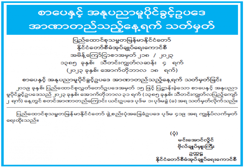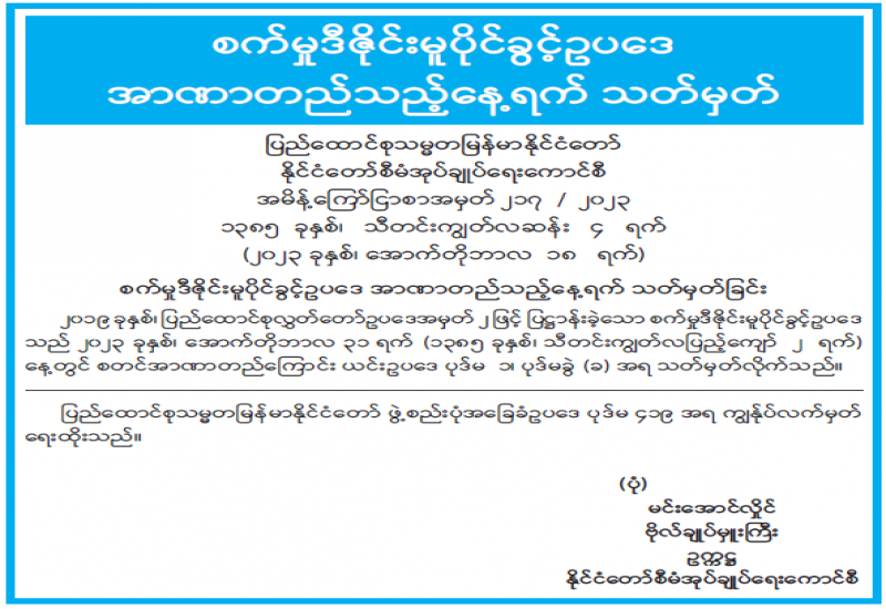 ​​​​​​​ပြန်ကြားရေးဝန်ကြီးဌာနသည် ပြည်ထောင်စုအစိုးရ၏သဘောတူညီချက်ဖြင့် ပုံနှိပ်ခြင်းနှင့်ထုတ်ဝေခြင်းလုပ်ငန်း နည်းဥပဒေများကို အမိန့်ကြော်ငြာစာအမှတ် (၄၈/၂၀၁၄) ဖြင့် ၂၀၁၄ ခုနှစ်၊ အောက်တိုဘာလ (၁၀)ရက်နေ့တွင် ထုတ်ပြန်ခဲ့ပြီးနောက် လုပ်ငန်းအသိအမှတ်ပြုလက်မှတ် လျှောက်ထားလာပါက ပုံနှိပ်ခြင်းနှင့်ထုတ်ဝေခြင်းလုပ်ငန်း နည်းဥပဒေများနှင့်အညီစိစစ်၍ လုပ်ငန်းအသိအမှတ်ပြုလက်မှတ်များကို ခွင့်ပြုပေးလျက် ရှိပါသည်။