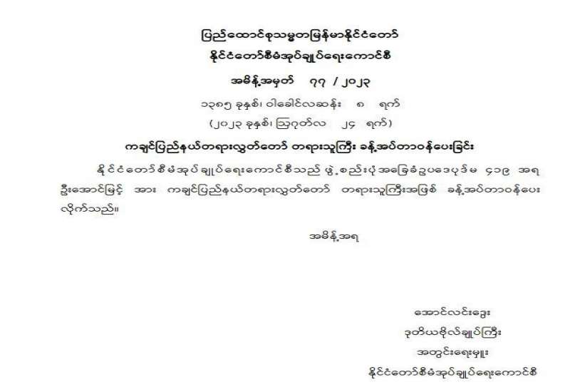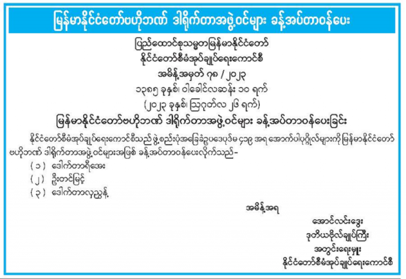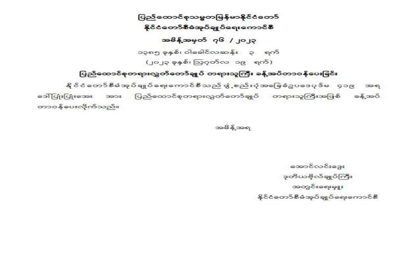 ကချင်ပြည်နယ်တရားလွှတ်တော် တရားသူကြီး ခန့်အပ်တာဝန်ပေးခြင်း
