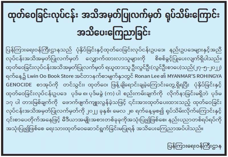 ထုတ်ဝေခြင်းလုပ်ငန်း အသိအမှတ်ပြုလက်မှတ် ရုပ်သိမ်းကြောင်း အသိပေးကြေညာ
