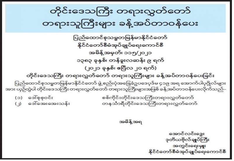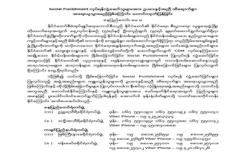 နိုင်ငံတော်စီမံအုပ်ချုပ်ရေးကောင်စီသည် နိုင်ငံတော်၏ နိုင်ငံရေး၊ စီးပွားရေး၊ လူမှုရေးဖွံ့ဖြိုး တိုးတက်ရေးအတွက် ရှေ့လုပ်ငန်းစဉ် (၅)ရပ်နှင့် ဦးတည်ချက် (၉)ရပ် ချမှတ်ဆောင်ရွက်လျက်ရှိရာ နိုင်ငံတော်ဖွံ့ဖြိုးတိုးတက်မှုကို လိုလားသည့် နိုင်ငံဝန်ထမ်းများသည် နိုင်ငံဝန်ထမ်းဥပဒေ၊ နည်းဥပဒေများ၊ ကျင့်ဝတ်များနှင့်အညီ မိမိတို့၏ တာဝန်ကို ကျေပွန်စွာ ထမ်းဆောင်လျက်ရှိကြရာ တည်ငြိမ်အေးချမ်းမှုနှင့် ဖွံ့ဖြိုးတိုးတက်မှုကို မလိုလားသော နိုင်ငံရေးအစွန်းရောက်အဖွဲ့အစည်းများ၊ ယင်းအဖွဲ့အစည်းဝင်များ၊ နိုင်ငံတော်၏ ကျေးဇူးသစ္စာနှင့် ဝန်ထမ်းကျင့်ဝတ်တို့ကို ဖောက်ဖျက်လျက် CDM လုပ်နေကြသော အချို့သော နိုင်ငံ့ဝန်ထမ်းများက ခြိမ်းခြောက်ခြင်း၊ Social Punishment ပြုလုပ်ရန် လှုံ့ဆော်ခြင်း၊ အထူးသဖြင့် နိုင်ငံတော်၏ ပညာရေးနှင့် ကျန်းမာရေးကဏ္ဍများတွင် တာဝန်ထမ်းဆောင်နေသည့် ဆရာ/ဆရာမများ၊ ဆရာဝန်များ၊ ကျန်းမာရေးဝန်ထမ်းများအား ခြိမ်းခြောက်ခြင်းများ ပြုလုပ်လျက် ရှိကြောင်း တွေ့ရှိရပါသည်။