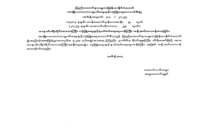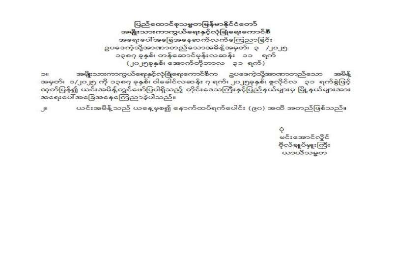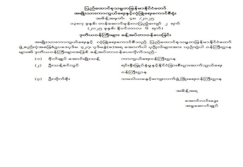 ၁။ သယံဇာတနှင့်သဘာဝပတ်ဝန်းကျင်ထိန်းသိမ်းရေးဝန်ကြီးဌာန၏ ကြီးကြပ်မှုဖြင့် မြန်မာ့ကျောက်မျက်ရတနာပြပွဲဗဟိုကော်မတီသည် ၂၀၂၅ ခုနှစ်၊ (၆၀) ကြိမ်မြောက် မြန်မာ့ကျောက်မျက်ရတနာပြပွဲကို နိုဝင်ဘာလ (၁၇) ရက်နေ့မှ (၂၆) ရက်နေ့အထိ နေပြည်တော်၊ မဏိရတနာကျောက်စိမ်းခန်းမတွင် ကျင်းပပြုလုပ်မည်ဖြစ်ပြီး ရတနာပြပွဲတွင် မြန်မာနိုင်ငံမှထွက်ရှိသော ပုလဲ၊ ကျောက်မျက်နှင့် ကျောက်စိမ်းအတွဲများကို တင်ပြရောင်းချသွားမည်ဖြစ်ပါသည်။
