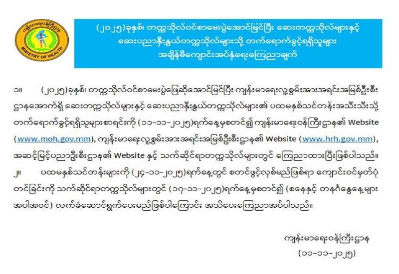 (၂ဝ၂၅) ခုနှစ်၊ တက္ကသိုလ်ဝင်စာမေးပွဲအောင်မြင်ပြီး ဆေးတက္ကသိုလ်များနှင့် ဆေးပညာနှီးနွယ်တက္ကသိုလ်များသို့ တက်ရောက်ခွင့်ရရှိသူများ အချိန်မီကျောင်းအပ်နှံရေး ကြေညာချက်