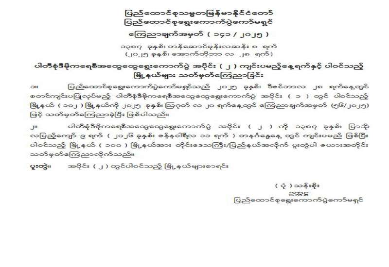 ပါတီစုံဒီမိုကရေစီအထွေထွေရွေးကောက်ပွဲအပိုင်း ( ၂ ) ကျင်းပမည့်နေ့ရက်နှင့် ပါဝင်သည့်မြို့နယ်များ သတ်မှတ်ကြေညာခြင်း