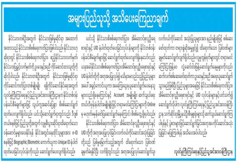 မြန်မာ့စီးပွားရေးဘဏ်များတွင် ပင်စင်လစာထုတ်ယူလျက်ရှိသော နိုင်ငံ့ဝန်ထမ်းအငြိမ်းစားများအနေဖြင့် ပင်စင်လစာထုတ်ယူရာ၌ လူပုဂ္ဂိုလ်စိစစ်မှုအား တိကျမှန်ကန်မြန်ဆန်စေရေးအတွက် မြန်မာ့စီးပွားရေးဘဏ်၏ Centralized e-Pension စနစ်နှင့်လူဝင်မှုကြီးကြပ်ရေးနှင့် ပြည်သူ့အင်အားဝန်ကြီးဌာန၏ e-ID စနစ်တို့ချိတ်ဆက်၍ ခေတ်မီနည်းပညာအသုံးပြု စိစစ်ဆောင်ရွက်နိုင်ရန် လူဝင်မှုကြီးကြပ်ရေးနှင့်ပြည်သူ့အင်အားဝန်ကြီးဌာန၊ သက်ဆိုင်ရာမြို့နယ်ဦးစီးမှူးရုံးများက အငြိမ်းစားဝန်ထမ်းများ၏ Biographic/Biometric ကောက်ယူကာ Unique ID နံပါတ် ထုတ်ပေးခြင်းလုပ်ငန်းကို ဆောင်ရွက်ပေးလျက်ရှိပါသည်။