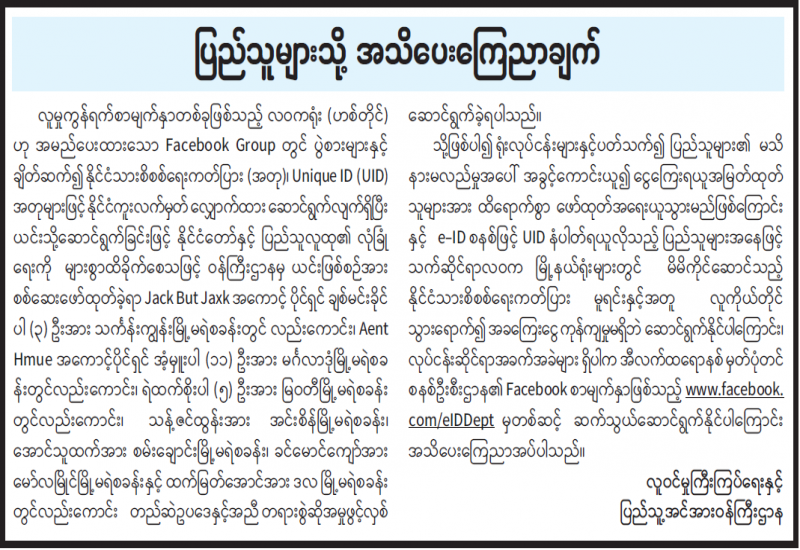 လူမှုကွန်ရက်စာမျက်နှာတစ်ခုဖြစ်သည့် လဝကရုံး(ဟစ်တိုင်)ဟု အမည်ပေးထားသော Facebook Group တွင် ပွဲစားများနှင့်ချိတ်ဆက်၍ နိုင်ငံသားစိစစ်ရေးကတ်ပြား(အတု)၊ Unique ID (UID) အတုများဖြင့် နိုင်ငံကူးလက်မှတ် လျှောက်ထားဆောင်ရွက်လျက်ရှိပြီး ယင်းသို့ဆောင်ရွက်ခြင်းဖြင့် နိုင်ငံတော်နှင့် ပြည်သူလူထု၏ လုံခြုံရေးကို များစွာထိခိုက်စေသဖြင့် ဝန်ကြီးဌာနမှ ယင်းဖြစ်စဉ်အား စစ်ဆေးဖော်ထုတ်ခဲ့ရာ Jack But Jaxk အကောင့်ပိုင်ရှင် ချစ်မင်းခိုင်ပါ (၃)ဦးအား သင်္ကန်းကျွန်းမြို့မရဲစခန်းတွင်လည်းကောင်း၊ Aent Hmue အကောင့်ပိုင်ရှင်အံ့မှူးပါ (၁၁)ဦးအား မင်္ဂလာဒုံမြို့မရဲစခန်းတွင်လည်းကောင်း၊ ရဲထက်စိုးပါ(၅)ဦးအား မြဝတီမြို့မရဲစခန်းတွင်လည်းကောင်း၊ သန့်ဇင်ထွန်းအား အင်းစိန်မြို့မရဲစခန်း၊ အောင်သူထက်အား စမ်းချောင်းမြို့မရဲစခန်း၊ ခင်မောင်ကျော်အား မော်လမြိုင်မြို့မရဲစခန်းနှင့် ထက်မြတ်အောင်အား ဒလမြို့မရဲစခန်းတွင်လည်းကောင်း တည်ဆဲဥပဒေနှင့်အညီ တရားစွဲဆိုအမှုဖွင့်လှစ်ဆောင်ရွက်ခဲ့ရပါသည်။