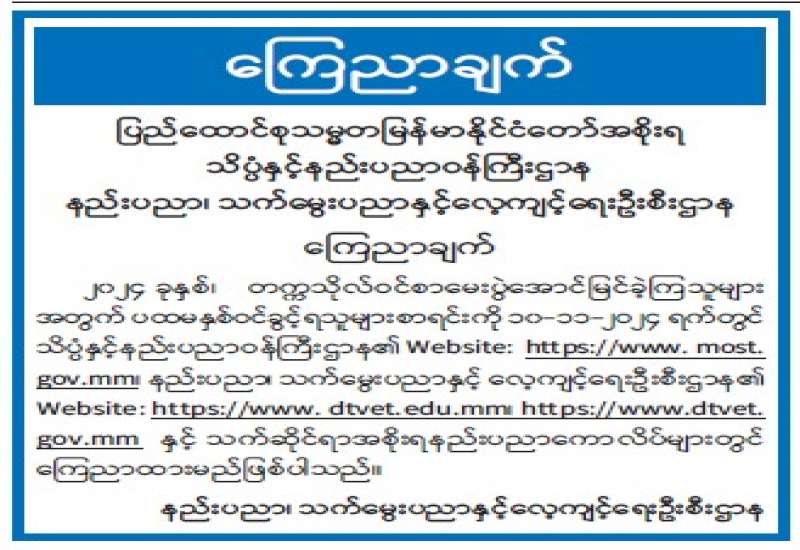 ၂၀၂၄ ခုနှစ်၊ တက္ကသိုလ်ဝင်စာမေးပွဲအောင်မြင်ခဲ့ကြသူများ အတွက် ပထမနှစ်ဝင်ခွင့်ရသူများစာရင်းကို (၁၀-၁၁-၂၀၂၄) ရက်တွင် သိပ္ပံနှင့်နည်းပညာဝန်ကြီးဌာန၏ Website: http://www.most.gov.mm၊ အဆင့်မြင့်သိပ္ပံနှင့်နည်းပညာဦးစီးဌာန၏ Website: http://www.dast.edu.mm နှင့် သက်ဆိုင်ရာတက္ကသိုလ်များတွင် ကြေညာထားမည်ဖြစ်ပါသည်