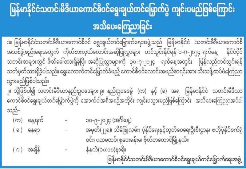 မြန်မာနိုင်ငံသတင်းမီဒီယာကောင်စီဝင်ရွေးချယ်တင်မြှောက်ပွဲ ကျင်းပမည်ဖြစ်ကြောင်း အသိပေးကြေညာခြင်း