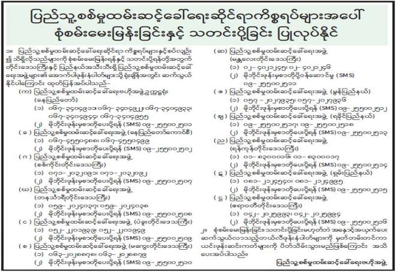၁။ ပြည်သူ့စစ်မှုထမ်းဆင့်ခေါ်ရေးဆိုင်ရာ ကိစ္စရပ်များနှင့်စပ်လျဉ်း၍ သိရှိလိုသည်များကို စုံစမ်းမေးမြန်းရန်နှင့် သတင်းပို့ရန်တို့အတွက် တိုင်းဒေသကြီးနှင့် ပြည်နယ်အသီးသီးရှိ ပြည်သူ့စစ်မှုထမ်းဆင့်ခေါ် ရေးအဖွဲ့များ၏ အောက်ပါဖုန်းနံပါတ်များသို့ ရုံးချိန်အတွင်း ဆက်သွယ် နိုင်ပါကြောင်း ထုတ်ပြန်အပ်ပါသည်-