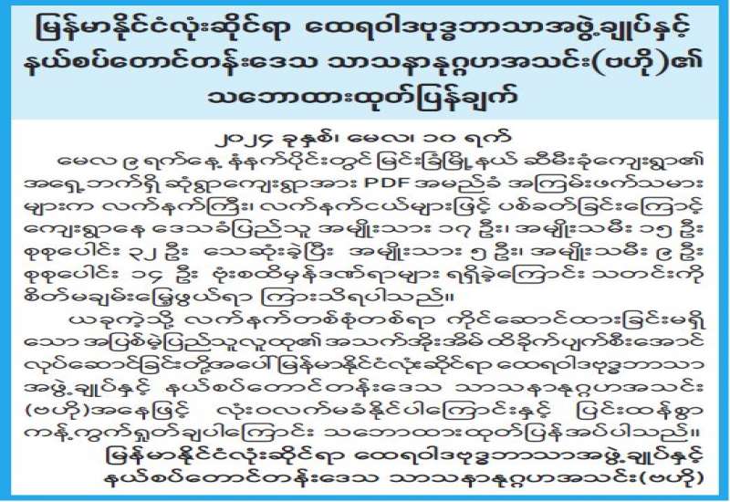 မေလ ၉ ရက်နေ့ နံနက်ပိုင်းတွင် မြင်းခြံမြို့နယ် ဆီမီးခုံကျေးရွာ၏ အရှေ့ဘက်ရှိ ဆုံရွာကျေးရွာအား PDF အမည်ခံ အကြမ်းဖက်သမားများက လက်နက်ကြီး၊ လက်နက်ငယ်များဖြင့် ပစ်ခတ်ခြင်းကြောင့် ကျေးရွာနေ ဒေသခံပြည်သူ အမျိုးသား ၁၇ ဦး၊ အမျိုးသမီး ၁၅ ဦး စုစုပေါင်း ၃၂ ဦး သေဆုံးခဲ့ပြီး အမျိုးသား ၅ ဦး၊ အမျိုးသမီး ၉ ဦး စုစုပေါင်း ၁၄ ဦး ဗုံးစထိမှန်ဒဏ်ရာများ ရရှိခဲ့ကြောင်း သတင်းကို စိတ်မချမ်းမြေ့ဖွယ်ရာ ကြားသိရပါသည်။