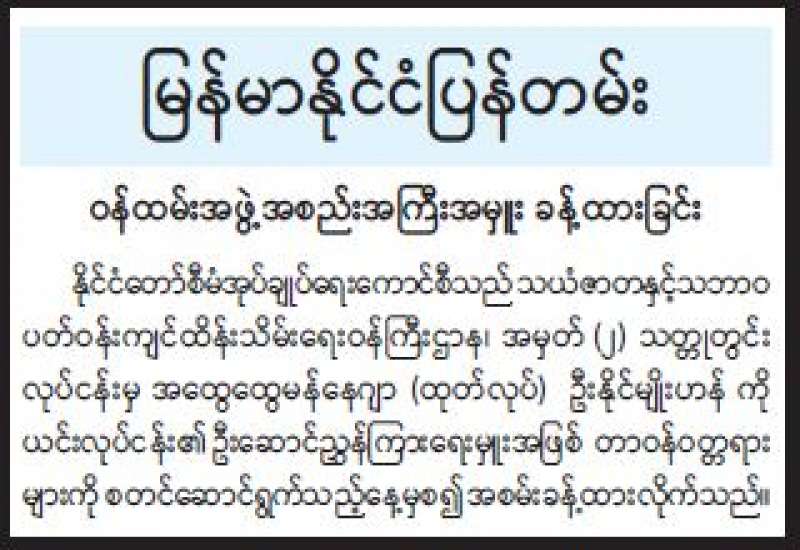 နိုင်ငံတော်စီမံအုပ်ချုပ်ရေးကောင်စီသည် သယံဇာတနှင့်သဘာဝ ပတ်ဝန်းကျင်ထိန်းသိမ်းရေးဝန်ကြီးဌာန၊ အမှတ် (၂) သတ္တုတွင်းလုပ်ငန်းမှ အထွေထွေမန်နေဂျာ (ထုတ်လုပ်) ဦးနိုင်မျိုးဟန်ကို ယင်းလုပ်ငန်း၏ ဦးဆောင်ညွှန်ကြားရေးမှူးအဖြစ် တာဝန်ဝတ္တရားများကို စတင်ဆောင်ရွက်သည့်နေ့မှစ၍ အစမ်းခန့်ထားလိုက်သည်။