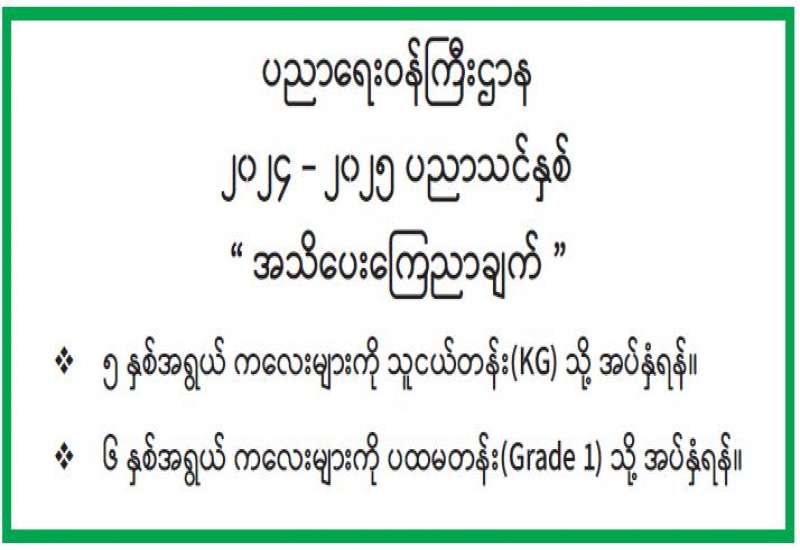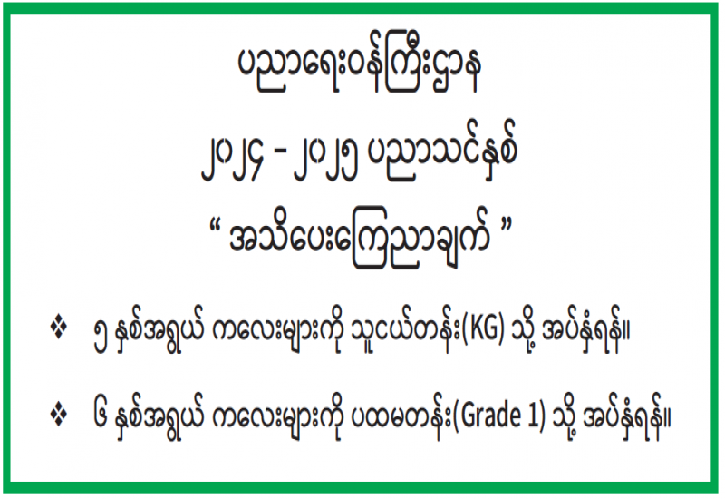 - ၅ နှစ်အရွယ် ကလေးများကို သူငယ်တန်း (KG) သို့ အပ်နှံရန်။