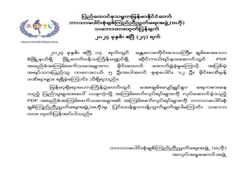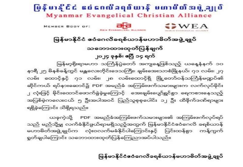 မြန်မာနိုင်ငံ ဧဝံဂေလိခရစ်ယာန်မဟာမိတ်အဖွဲ့ချုပ် သဘောထားထုတ်ပြန်ချက်