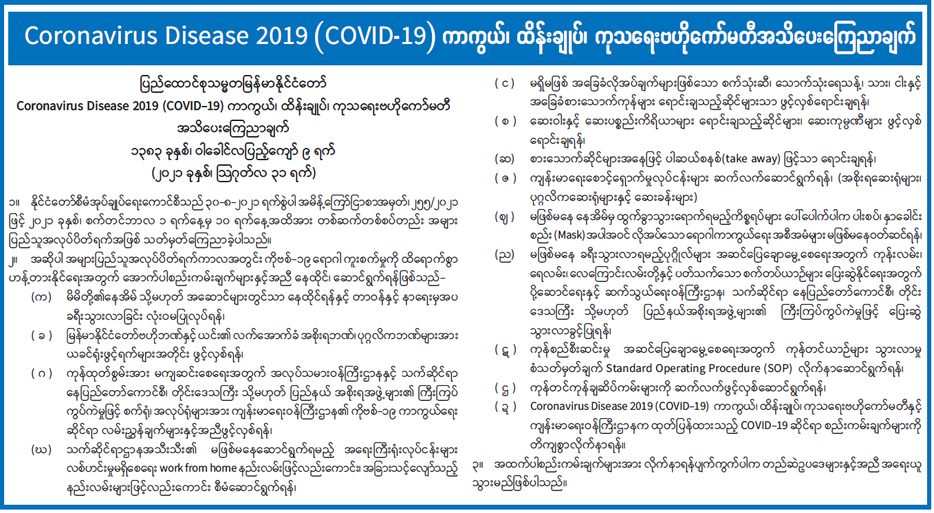 Coronavirus Disease 2019 (COVID-19) ကာကွယ်၊ ထိန်းချုပ်၊ ကုသရေးဗဟိုကော်မတီ အသိပေးကြေညာချက် 09/01/2021 Coronavirus Disease 2019 (COVID-19) ကာကွယ်၊ ထိန်းချုပ်၊ ကုသရေးဗဟိုကော်မတီ အသိပေးကြေညာချက်