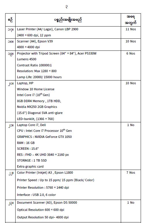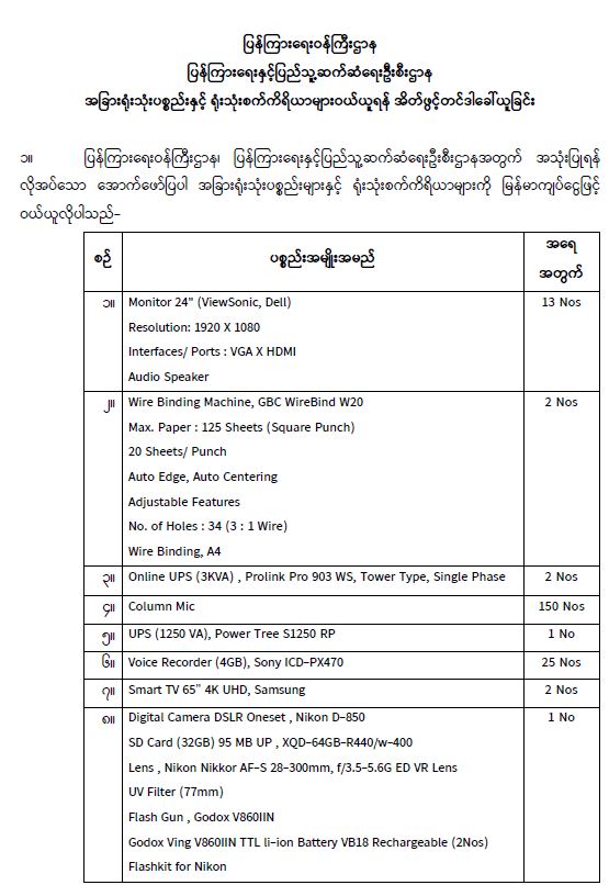 ပြန်ကြားရေးနှင့်ပြည်သူ့ဆက်ဆံရေးဦးစီးဌာန အခြားရုံးသုံးပစ္စည်းနှင့် ရုံးသုံးစက်ကိရိယာများဝယ်ယူရန် အိတ်ဖွင့်တင်ဒါခေါ်ယူခြင်း