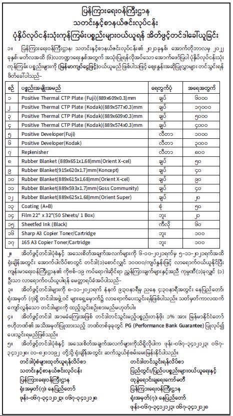 ပြန်ကြားရေးဝန်ကြီးဌာန သတင်းနှင့်စာနယ်ဇင်းလုပ်ငန်း ပုံနှိပ်လုပ်ငန်းသုံးကုန်ကြမ်းပစ္စည်းများဝယ်ယူရန် အိတ်ဖွင့်တင်ဒါခေါ်ယူခြင်း 10/08/2021 ပြန်ကြားရေးဝန်ကြီးဌာန သတင်းနှင့်စာနယ်ဇင်းလုပ်ငန်း ပုံနှိပ်လုပ်ငန်းသုံးကုန်ကြမ်းပစ္စည်းများဝယ်ယူရန် အိတ်ဖွင့်တင်ဒါခေါ်ယူခြင်း