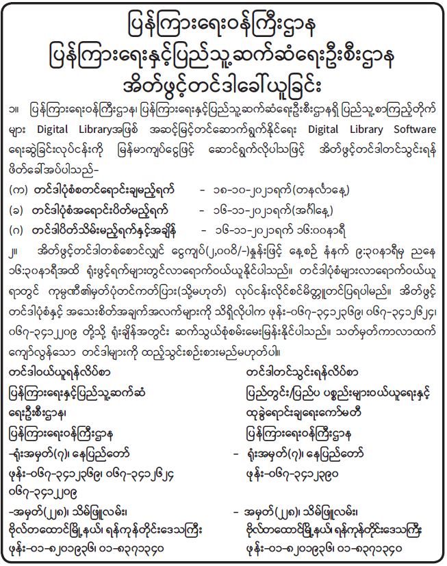 ပြန်ကြားရေးနှင့်ပြည်သူ့ဆက်ဆံရေးဦးစီးဌာန ပြည်သူ့စာကြည့်တိုက်များ Digital Library အဖြစ် အဆင့်မြှင့်တင်ဆောင်ရွက်နိုင်ရေး Digital Library Software ရေးဆွဲခြင်းလုပ်ငန်းကို မြန်မာကျပ်ငွေဖြင့် ဆောင်ရွက်လိုပါသဖြင့် အိတ်ဖွင့်တင်ဒါခေါ်ယူခြင်း