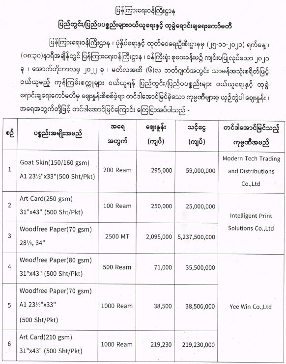 ပြန်ကြားရေးဝန်ကြီးဌာန၊ ပြည်တွင်း/ပြည်ပပစ္စည်းများ ဝယ်ယူရေးနှင့် ထုခွဲရောင်းချရေးကော်မတီမှ ဈေးနှုန်းစိစစ်ခဲ့ရာ ဖော်ပြပါကုမ္ပဏီများမှ ယှဉ်တွဲပါဈေးနှုန်းများဖြင့် တင်ဒါအောင်မြင်ကြောင်း ကြေညာခြင်း 11/25/2021