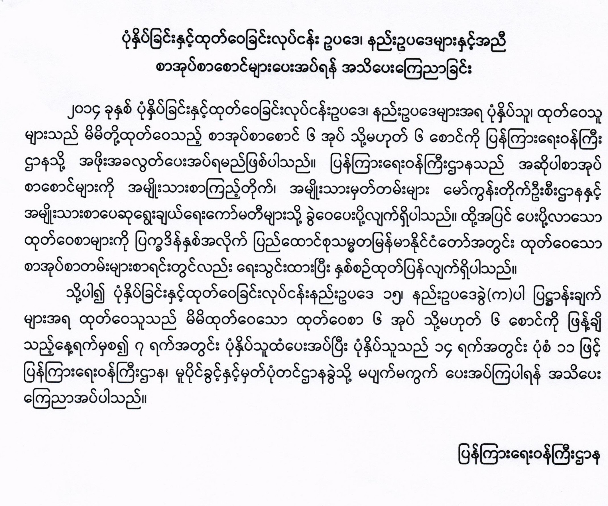 ပုံနှိပ်ခြင်းနှင့် ထုတ်ဝေခြင်းလုပ်ငန်း ဥပဒေ၊ နည်းဥပဒေများနှင့်အညီ စာအုပ်စာစောင်များ ပေးအပ်ရန် အသိပေးကြေညာခြင်း 02/14/2022