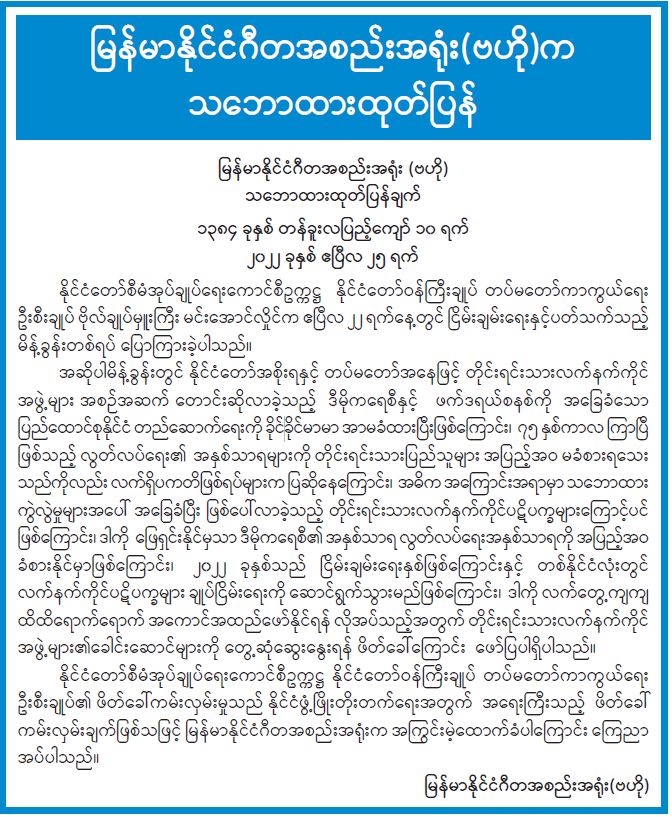 နိုင်ငံတော်စီမံအုပ်ချုပ်ရေးကောင်စီဥက္ကဋ္ဌ နိုင်ငံတော်ဝန်ကြီးချုပ်၊ တပ်မတော်ကာကွယ်ရေး ဦးစီးချုပ် ဗိုလ်ချုပ်မှူးကြီး မင်းအောင်လှိုင်၏ ငြိမ်းချမ်းရေးနှင့်ပတ်သက်၍ ပြောကြားချက်များအပေါ် မြန်မာနိုင်ငံ ဂီတအစည်းအရုံး(ဗဟို)က အကြွင်းမဲ့ထောက်ခံကြောင်း ကြေညာ