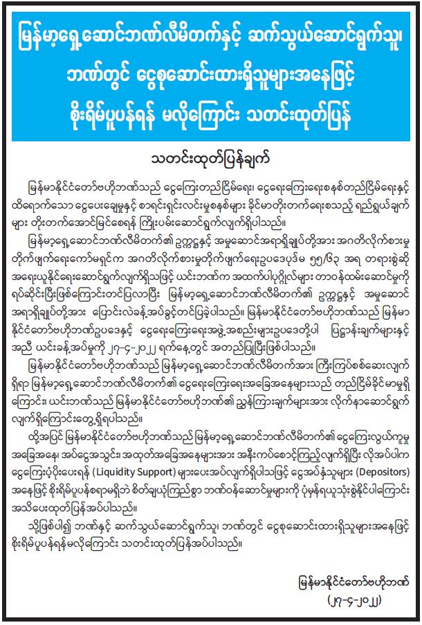 မြန်မာ့ရှေ့ဆောင်ဘဏ်လီမိတက်နှင့် ဆက်သွယ်ဆောင်ရွက်သူ၊ ဘဏ်တွင် ငွေစုဆောင်းထားရှိသူများအနေဖြင့် စိုးရိမ်ပူပန်ရန် မလိုကြောင်း သတင်းထုတ်ပြန် 04/28/2022