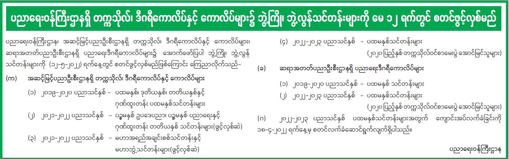 ပညာရေးဝန်ကြီးဌာနရှိ တက္ကသိုလ်၊ ဒီဂရီကောလိပ်နှင့် ကောလိပ်များ၌ ဘွဲ့ကြို၊ ဘွဲ့လွန်သင်တန်းများကို မေ ၁၂ ရက်တွင် စတင်ဖွင့်လှစ်မည်