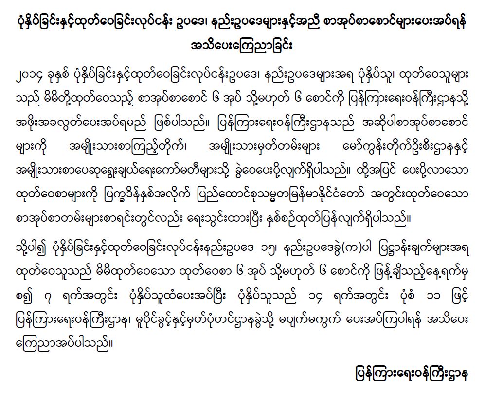 ပုံနှိပ်ခြင်းနှင့်ထုတ်ဝေခြင်းလုပ်ငန်း ဥပဒေ၊ နည်းဥပဒေများနှင့်အညီ စာအုပ်စာစောင်များပေးအပ်ရန် အသိပေးကြေညာခြင်း