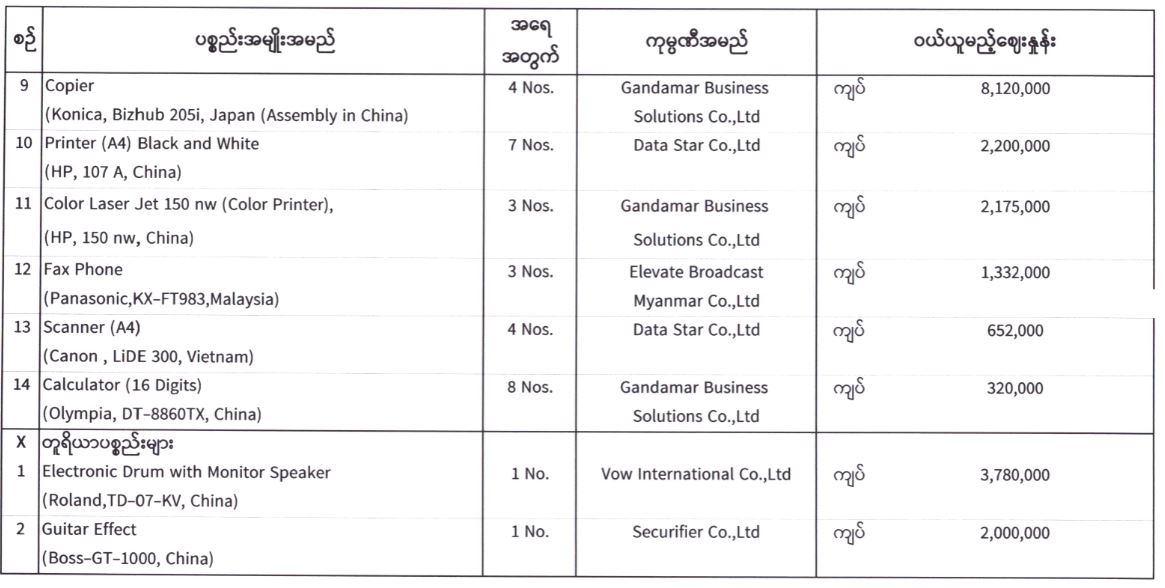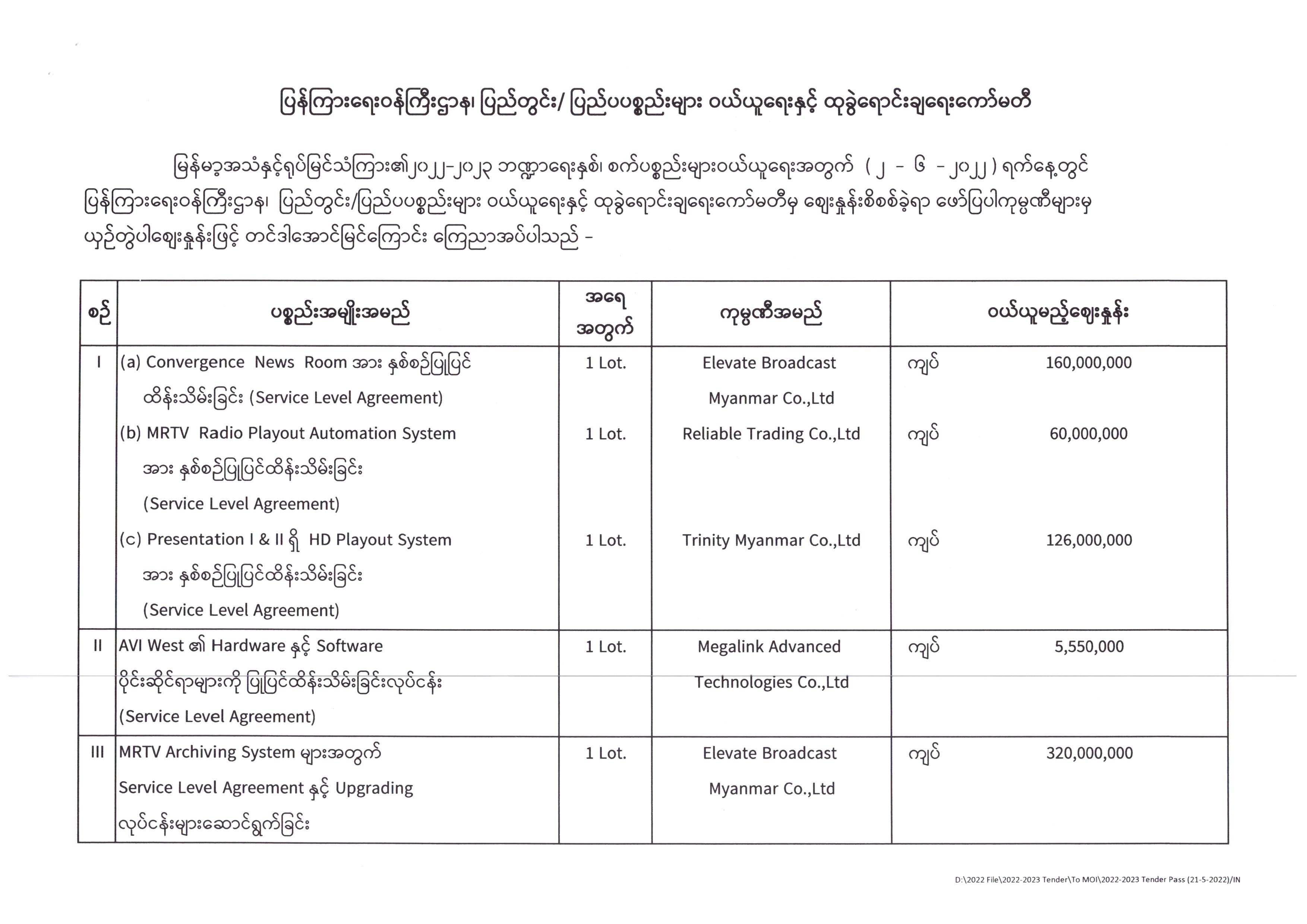 ပြန်ကြားရေးဝန်ကြီးဌာန၊ ပြည်တွင်း/ပြည်ပ ပစ္စည်းများဝယ်ယူရေးနှင့်ထုခွဲရောင်းချရေးကော်မတီအဖွဲ့၊ တင်ဒါအောင်မြင်ကြောင်းကြေညာခြင်း 06/08/2022