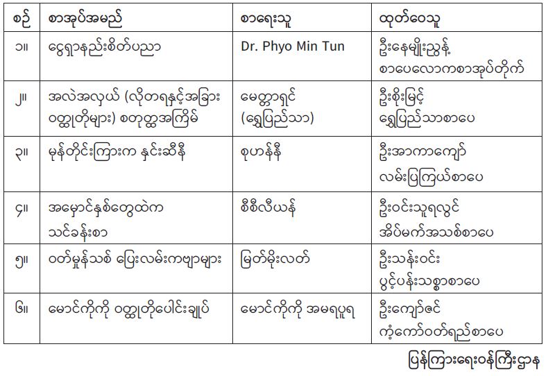 ပြန်ကြားရေးဝန်ကြီးဌာနသည် အဆိုပါစာအုပ် စာစောင်များကိုမူပိုင်ခွင့်နှင့် စာအုပ်စာရင်းနှစ်အုပ်၊ အမျိုးသားစာပေဆုစိစစ်ရွေးချယ်ရေးကော်မတီသို့ နှစ်အုပ်နှင့် အမျိုးသားမှတ်တမ်းများ မော်ကွန်းတိုက်ဦးစီးဌာနသို့တစ်အုပ် ပေးပို့လျက်ရှိပါသည်။