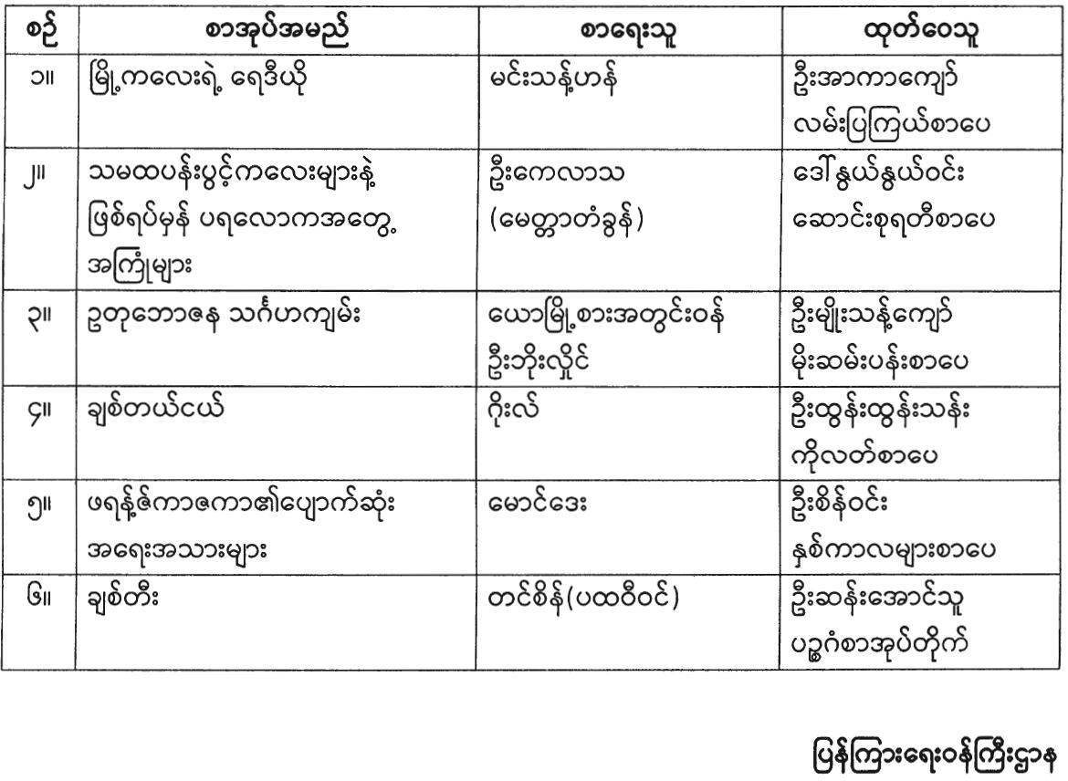 ပုံနှိပ်ခြင်းနှင့်ထုတ်ဝေခြင်းလုပ်ငန်းဥပဒေအရ ထုတ်ဝေသူသည် မိမိထုတ်ဝေသော ထုတ်ဝေစာ ၅ အုပ် သို့မဟုတ် ၅ စောင်ကို ဖြန့်ချိသည့်နေ့မှစ၍ ၁၄ ရက်အတွင်း ပုံစံ(၁၁)ဖြင့် ပြန်ကြားရေးဝန်ကြီးဌာန၊ ပြန်ကြားရေးနှင့်ပြည်သူ့ဆက်ဆံရေးဦးစီးဌာန၊ မူပိုင်ခွင့်နှင့်မှတ်ပုံတင်ဌာနခွဲသို့ ပေးပို့အပ်နှံရမည်ဖြစ်ပါသည်။ ယခုအခါ အောက်ဖော်ပြပါထုတ်ဝေသူများသည် ပုံနှိပ်ခြင်းနှင့်ထုတ်ဝေခြင်းလုပ်ငန်းဥပဒေနှင့်အညီ မူပိုင်ခွင့်နှင့်မှတ်ပုံတင်ဌာနခွဲသို့ ပေးပို့အပ်နှံရန် ပျက်ကွက်လျက်ရှိပါသဖြင့် အမြန်ဆုံးပေးအပ်နိုင်ပါရန် အသိပေးကြေညာအပ်ပါသည်-