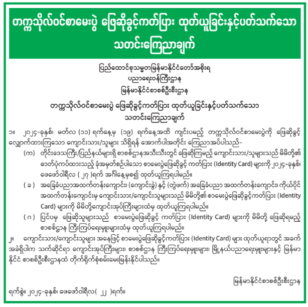 တက္ကသိုလ်ဝင်စာမေးပွဲ ဖြေဆိုခွင့်ကတ်ပြား ထုတ်ယူခြင်းနှင့်ပတ်သက်သော သတင်းကြေညာချက်