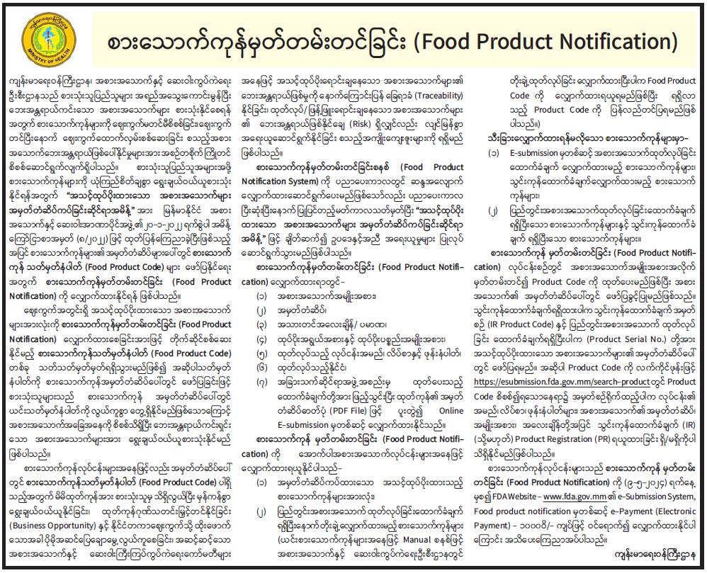 စားသောက်ကုန်လုပ်ငန်းများသည် စားသောက်ကုန်မှတ်တမ်းတင်ခြင်း (Food Product Notification) ကို (၉-၅-၂၀၂၄) ရက်နေ့မှစ၍ FDA Website - www.fda.gov.mm ၏ e-Submission System, Food product notificationမှတစ်ဆင့် e-Payment (Electronic Payment) - ကျပ် ၁၀၀၀ဝ ဖြင့် ဝင်ရောက်၍ လျှောက်ထားနိုင်ပါကြောင်း အသိပေးကြေညာအပ် ပါသည်။