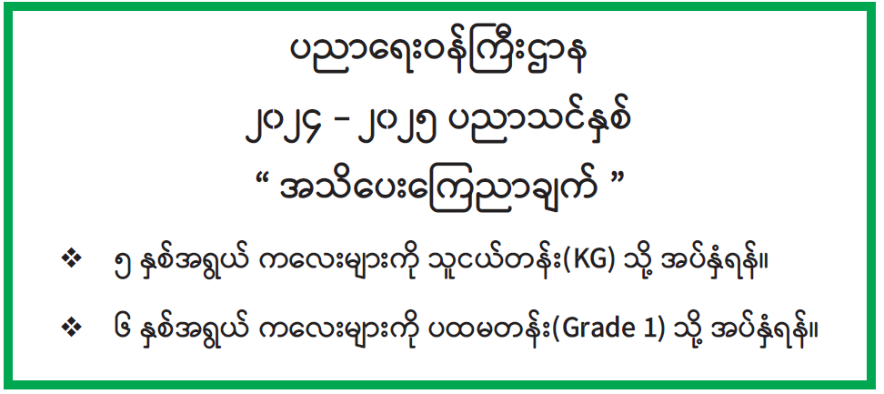- ၆ နှစ်အရွယ် ကလေးများကို ပထမတန်း (Grade 1) သို့ အပ်နှံရန်။