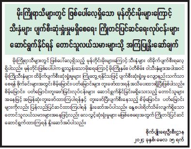 မိုးကြိုရာသီများတွင် ဖြစ်ပေါ်လေ့ရှိသည့် မုန်တိုင်းမိုးများကြောင့် သီးနှံများ ထိခိုက်ပျက်စီးရလေ့ရှိပါသည်။ မုန်တိုင်းဖြစ်ပေါ်ပါက ရွာသွန်းသောမိုးရေကြောင့် မိုးကြိုနှမ်း၊ ပဲတီစိမ်း၊ ဝါသီးနှံများအပါအဝင် မိုးကြိုသီးနှံများ ထိခိုက်ပျက်စီးဆုံးရှုံးမှုများ ကြုံတွေ့ရနိုင်သဖြင့် ပျက်စီးဆုံးရှုံးမှု လျော့နည်းသက်သာစေရန် စိုက်ခင်းများအတွင်း စိမ့်မြောင်း၊ ပတ်မြောင်းများ တူးဖော်ထားရန် အသိပေးထားရှိပြီးဖြစ်ပါသည်။ စိမ့်မြောင်း၊ ပတ်မြောင်းတူးဖော်ခြင်းလုပ်ငန်းများ ဆောင်ရွက်နိုင်ခြင်းမရှိသေးသည့် တောင်သူများအနေဖြင့် အမြန်ဆုံးတူးဖော်ထားကြပါရန်နှင့် တူးဖော်ပြီးပျက်စီးနေသည့် စိမ့်မြောင်း၊ ပတ်မြောင်းများကိုလည်း ပြန်လည်ပြင်ဆင်ထားကြပါရန် နှိုးဆော်အပ်ပါသည်။ နွေစပါးရိတ်သိမ်းလျက်ရှိသော တောင်သူလယ်သမားများအနေဖြင့်လည်း လေလွင့်ဆုံးရှံးမှုများ မဖြစ်စေရေးအတွက် ကြိုတင်ပြင်ဆင်ဆောင်ရွက်ထားကြရန် နှိုးဆော်အပ်ပါသည်။
