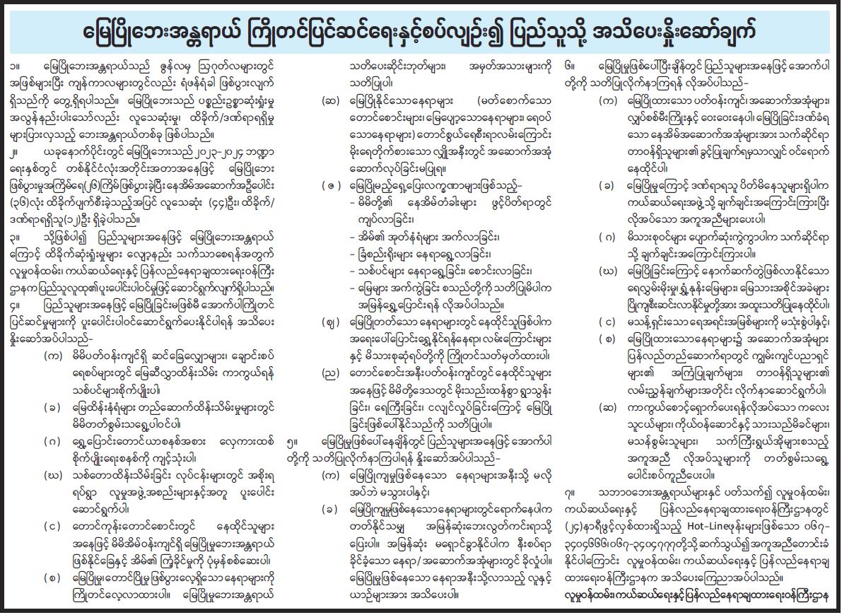 ၇။ သဘာဝဘေးအန္တရာယ်များနှင်ပတ်သက်၍ လူမှုဝန်ထမ်း၊ ကယ်ဆယ်ရေးနှင့်ပြန်လည်နေရာချထားရေးဝန်ကြီးဌာနတွင် (၂၄)နာရီဖွင့်လှစ်ထားရှိသည့် Hot-Lineဖုန်းများဖြစ်သော ၀၆၇-၃၄၀၄၆၆၆၊ ၀၆၇-၃၄၀၄၇၇၇တို့သို့ ဆက်သွယ်၍ အကူအညီတောင်းခံနိုင်ပါကြောင်း လူမှုဝန်ထမ်း၊ ကယ်ဆယ်ရေးနှင့်ပြန်လည်နေရာချ ထားရေးဝန်ကြီးဌာနက အသိပေးကြေညာအပ်ပါသည်။