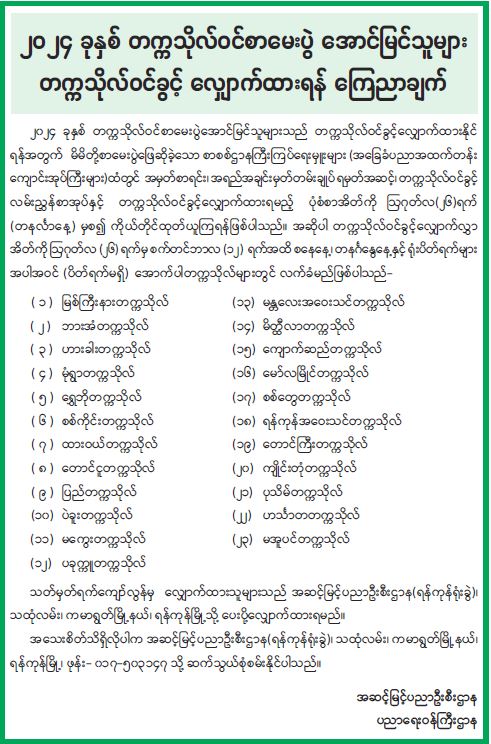 ၂ဝ၂၄ ခုနှစ် တက္ကသိုလ်ဝင်စာမေးပွဲ အောင်မြင်သူများ တက္ကသိုလ်ဝင်ခွင့်လျှောက်ထားရန် ကြေညာချက်