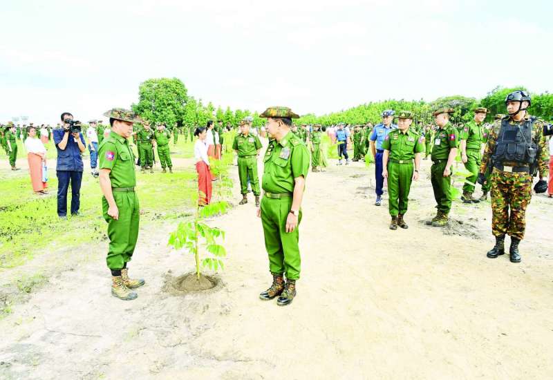 ပြည်ထောင်စုနယ်မြေ၊ နေပြည်တော်၊ ၂၀၂၅ ခုနှစ်၊ ပထမအကြိမ် မိုးရာသီသစ်ပင်စိုက်ပျိုးပွဲအခမ်းအနားကို ယနေ့နံနက်ပိုင်းတွင် ပြည်ထောင်စုနယ်မြေ နေပြည်တော်၊ ဒက္ခိဏသီရိမြို့နယ်၊ ရန်အောင်မြင်ကြိုးဝိုင်း၌ကျင်းပရာ နိုင်ငံတော်စီမံအုပ်ချုပ်ရေးကောင်စီဥက္ကဋ္ဌ နိုင်ငံတော်ဝန်ကြီးချုပ် ဗိုလ်ချုပ်မှူးကြီးမင်းအောင်လှိုင် တက်ရောက်၍ ကံ့ကော်ပျိုးပင်ကို ဦးဆောင်စိုက်ပျိုးပေးသည်။