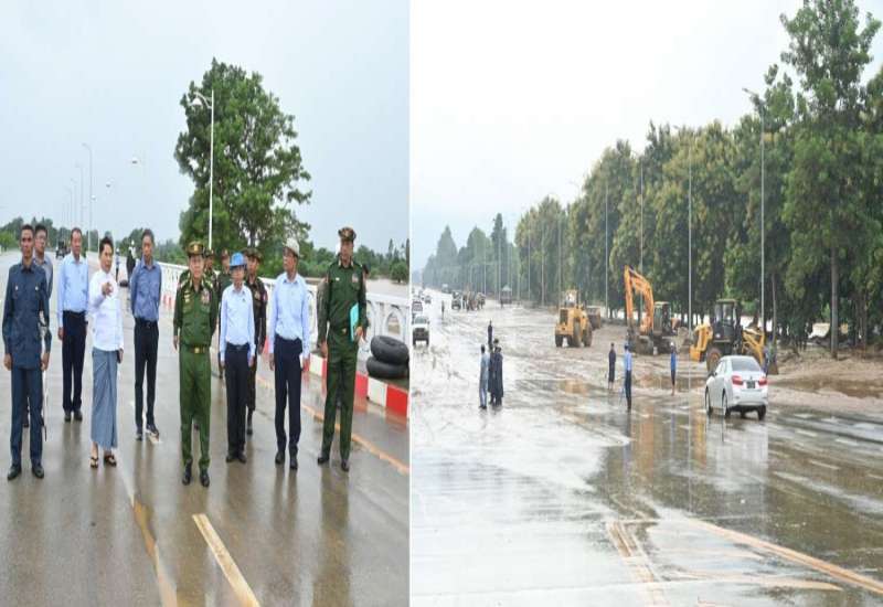 နိုင်ငံတော်စီမံအုပ်ချုပ်ရေးကောင်စီဥက္ကဋ္ဌ နိုင်ငံတော်ဝန်ကြီးချုပ် ဗိုလ်ချုပ်မှူးကြီး မင်းအောင်လှိုင်သည် ယနေ့နံနက်ပိုင်းတွင် ကောင်စီတွဲဖက်အတွင်းရေးမှူး ဗိုလ်ချုပ်ကြီး ရဲဝင်းဦး၊ ပြည်ထောင်စုဝန်ကြီးများဖြစ်ကြသည့် ဦးမင်းနောင်၊ ဦးမျိုးသန့်၊ နေပြည်တော်ကောင်စီဥက္ကဋ္ဌ ဦးသန်းထွန်းဦး၊ ကာကွယ်ရေးဦးစီးချုပ်ရုံးမှ အဆင့်မြင့်တပ်မတော်အရာရှိကြီးများ၊ နေပြည်တော်တိုင်းစစ်ဌာနချုပ်တိုင်းမှူးနှင့် တာဝန်ရှိသူများလိုက်ပါ၍ နေပြည်တော်ကောင်စီနယ်မြေအတွင်း မိုးအဆက်မပြတ်ရွာသွန်းမှုကြောင့် ပျက်စီးမှုများဖြစ်ပေါ်ခဲ့သည့် လမ်းတံတားများအား ပြန်လည်ပြုပြင်ဆောင်ရွက်နေမှုနှင့် ရေကြီးရေလျှံမှု ဖြစ်ပေါ်ခဲ့မှုအခြေအနေများကို လိုက်လံကြည့်ရှုစစ်ဆေးသည်။