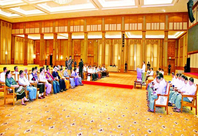 (၇၆)နှစ်မြောက်လွတ်လပ်ရေးနေ့အထိမ်းအမှတ် ဂုဏ်ထူးဆောင်ဘွဲ့များ ချီးမြှင့်အပ်နှင်းခြင်းအခမ်းအနားကို နိုင်ငံတော်စီမံအုပ်ချုပ်ရေးကောင်စီဥက္ကဋ္ဌရုံး သဘင်ဆောင်၌ ယနေ့နံနက်ပိုင်းတွင်ကျင်းပရာ နိုင်ငံတော်စီမံအုပ်ချုပ်ရေးကောင်စီဥက္ကဋ္ဌ နိုင်ငံတော်ဝန်ကြီးချုပ် ဗိုလ်ချုပ်မှူးကြီး သတိုးမဟာသရေစည်သူ သတိုးသီရိသုဓမ္မမင်းအောင်လှိုင် တက်ရောက်အမှာစကားပြောကြားပြီး ဂုဏ်ထူးဆောင်ဘွဲ့များ ချီးမြှင့်အပ်နှင်းသည်။