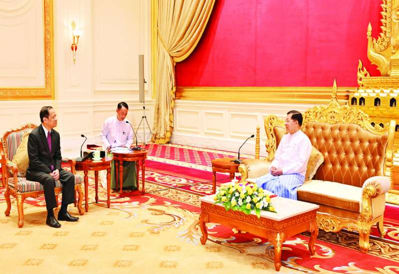 နိုင်ငံတော်စီမံအုပ်ချုပ်ရေးကောင်စီဥက္ကဋ္ဌ နိုင်ငံတော်ဝန်ကြီးချုပ်ဗိုလ်ချုပ်မှူးကြီး မင်းအောင်လှိုင်သည် အာဆီယံဥက္ကဋ္ဌ၏ မြန်မာနိုင်ငံဆိုင်ရာ အထူးကိုယ်စားလှယ်ဖြစ်သူ H.E. Mr. Alounkeo Kittikhoun အား ယနေ့နံနက်ပိုင်းတွင် နေပြည်တော်ရှိ နိုင်ငံတော်စီမံအုပ်ချုပ်ရေးကောင်စီဥက္ကဋ္ဌရုံး သံတမန်ဆောင်ဧည့်ခန်းမ၌ လက်ခံတွေ့ဆုံသည်။