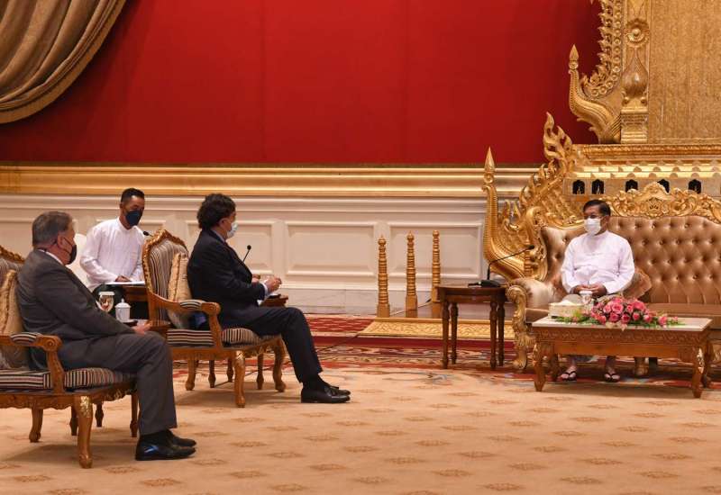 နိုင်ငံတော်စီမံအုပ်ချုပ်ရေးကောင်စီဥက္ကဋ္ဌ နိုင်ငံတော်ဝန်ကြီးချုပ် ဗိုလ်ချုပ်မှူးကြီး မင်းအောင်လှိုင်သည် အမေရိကန်နိုင်ငံ၊ နယူးမက္ကဆီကိုပြည်နယ် အုပ်ချုပ်ရေးမှူးဟောင်း မစ္စတာဘီလ်ရစ်ချတ်ဆန်အား ယနေ့မွန်းလွဲပိုင်းတွင် နေပြည်တော်ရှိ နိုင်ငံတော်စီမံအုပ်ချုပ်ရေးကောင်စီဥက္ကဋ္ဌရုံး၊ သံတမန်ဆောင် ဧည့်ခန်းမ၌ လက်ခံတွေ့ဆုံသည်။