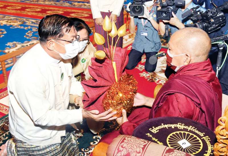 ပြည်ထောင်စုသမ္မတမြန်မာနိုင်ငံတော်၊ နိုင်ငံတော်စီမံအုပ်ချုပ်ရေးကောင်စီ ၂၀၂၁ ခုနှစ် ကထိန်သင်္ကန်း ဆက်ကပ်လှူဒါန်းပွဲ အခမ်းအနားကို ယနေ့နံနက်ပိုင်းတွင် နေပြည်တော်ရှိ ဥပ္ပါတသန္တိစေတီတော်၊ သာသနာ့မဟာဗိမာန်တော်၌ ကျင်းပပြုလုပ်ရာ နိုင်ငံတော်စီမံအုပ်ချုပ်ရေး ကောင်စီဥက္ကဋ္ဌ နိုင်ငံတော်ဝန်ကြီးချုပ် ဗိုလ်ချုပ်မှူးကြီး မင်းအောင်လှိုင်နှင့် ဇနီးဒေါ်ကြူကြူလှတို့ တက်ရောက်၍ ကထိန်လျာသင်္ကန်းနှင့် လှူဖွယ်ပစ္စည်းများ ဆက်ကပ်လှူဒါန်းသည်။