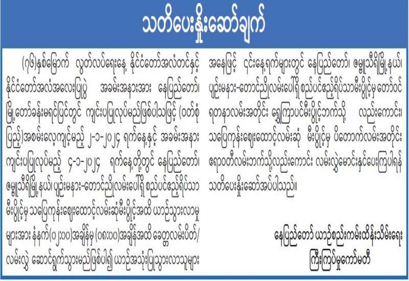 (၇၆)နှစ်မြောက်လွတ်လပ်ရေးနေ့ နိုင်ငံတော်အလံတင်နှင့် နိုင်ငံတော်အလံအလေးပြုပွဲ အခမ်းအနားအား နေပြည်တော်၊ မြို့တော်ခန်းမရင်ပြင်တွင် ကျင်းပပြုလုပ်မည်ဖြစ်ပါသဖြင့် (ဝတ်စုံပြည့်)အစမ်းလေ့ကျင့်မည့် ၂-၁-၂၀၂၄ ရက်နေ့နှင့် အခမ်းအနား ကျင်းပပြုလုပ်မည့် ၄-၁-၂၀၂၄ ရက်နေ့တို့တွင် နေပြည်တော်၊ ဇမ္ဗူသီရိမြို့နယ်၊ ပျဉ်းမနား-တောင်ညိုလမ်းပေါ်ရှိ စည်ပင်ဧည့်ရိပ်သာ မီးပွိုင့်မှ သပြေကုန်းဈေးထောင့်လမ်းဆုံမီးပွိုင့်အထိ ယာဉ်သွားလာမှုများအား နံနက်(၀၂:၀၀)အချိန်မှ (၀၈:၀၀)အချိန်အထိ ခေတ္တလမ်းပိတ်/လမ်းလွှဲ ဆောင်ရွက်သွားမည်ဖြစ်ပါ၍ ယာဉ်အသုံးပြုသွားလာသူများ အနေဖြင့် ၎င်းနေ့ရက်များတွင် နေပြည်တော်၊ ဇမ္ဗူသီရိမြို့နယ်၊ ပျဉ်းမနား-တောင်ညိုလမ်းပေါ်ရှိ စည်ပင်ဧည့်ရိပ်သာမီးပွိုင့်မှတော်ဝင် ရတနာလမ်းအတိုင်း ရွှေကြာပင်မီးပွိုင့်ဘက်သို့လည်းကောင်း၊ သပြေကုန်းဈေးထောင့်လမ်းဆုံ မီးပွိုင့်မှ ပိတောက်လမ်းအတိုင်း ဧရာဝတီလမ်းဘက်သို့လည်းကောင်း လမ်းလွှဲမောင်းနှင်ပေးကြပါရန် သတိပေးနှိုးဆော်အပ်ပါသည်။