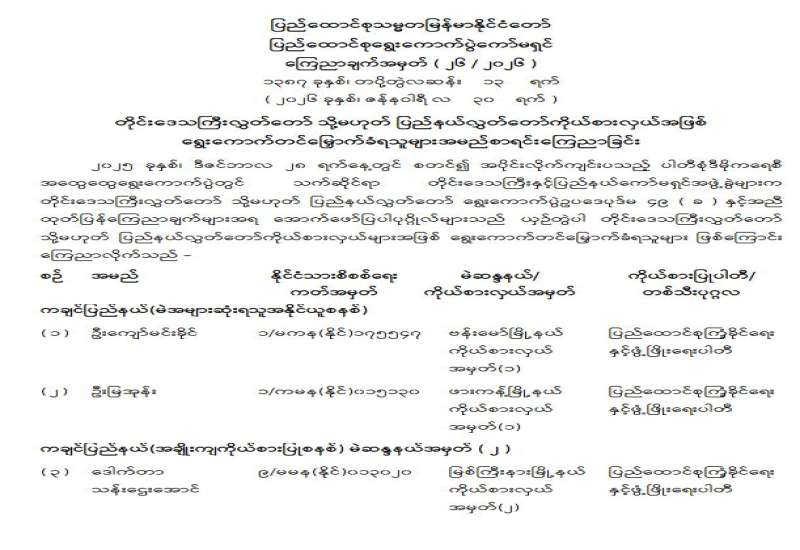 တိုင်းဒေသကြီးလွှတ်တော် သို့မဟုတ် ပြည်နယ်လွှတ်တော်ကိုယ်စားလှယ်အဖြစ် ရွေးကောက်တင်မြှောက်ခံရသူများ အမည်စာရင်းကြေညာခြင်း