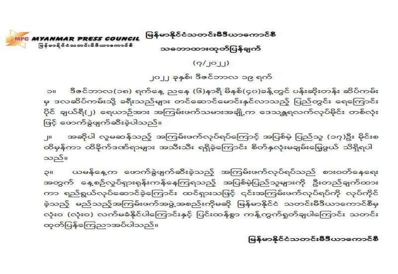မြန်မာနိုင်ငံသတင်းမီဒီယာကောင်စီ သဘောထားထုတ်ပြန်ချက် ၂၀၂၂ ခုနှစ် ဒီဇင်ဘာ ၁၉